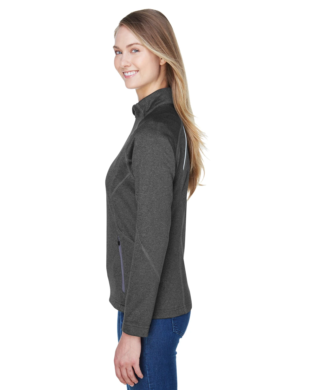 Front reverse coil zipper with reflective asymmetric piping