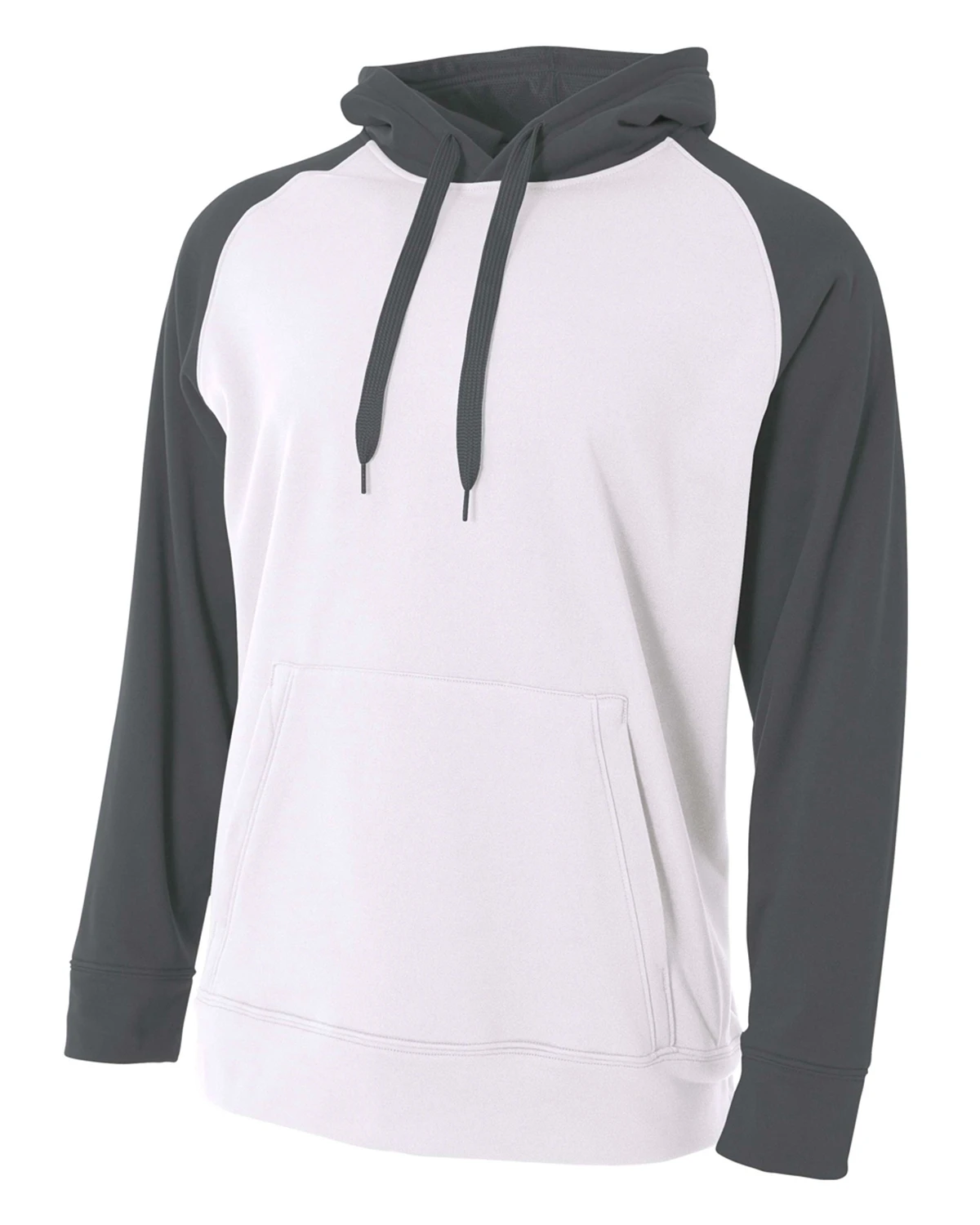 Raglan sleeves, self fabric cuff and waistband, wide tipped draw cord