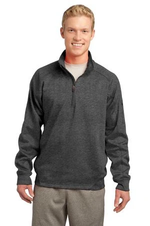 Cool, dry and colorfast, this quarter-zip pullover has a pill-resistant, snag-resistant face with a matte finish and brushed backing for comfort. It features double-knit construction, as well as a zippered pocket on the left sleeve and a chin guard.