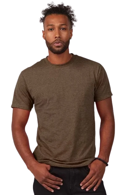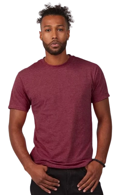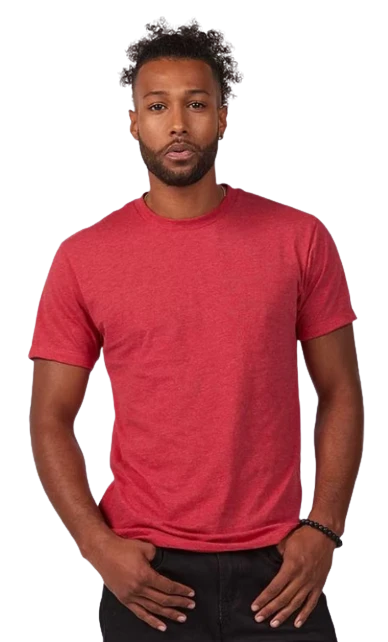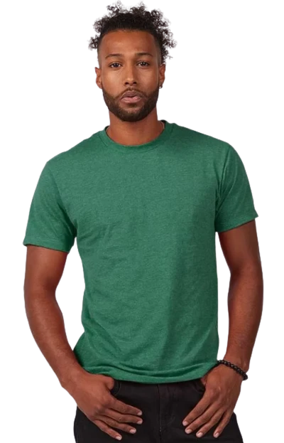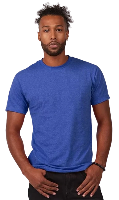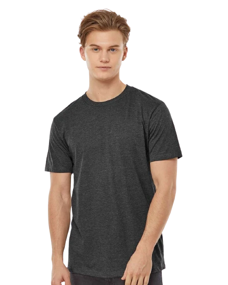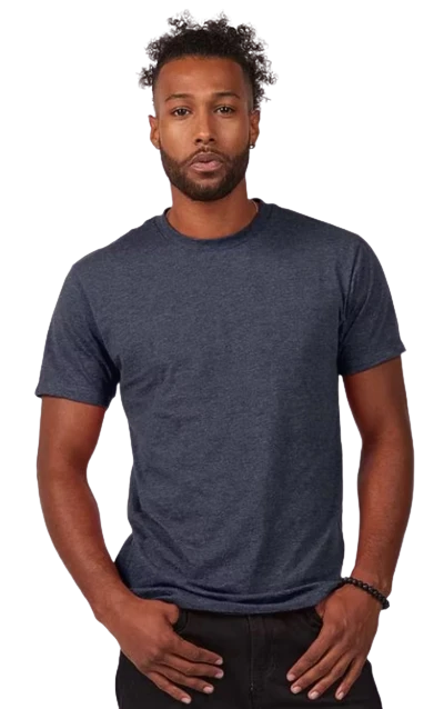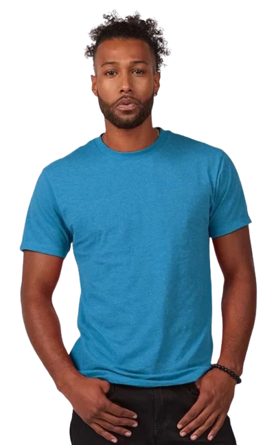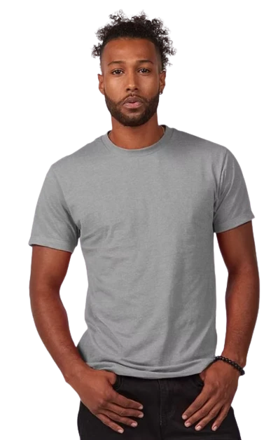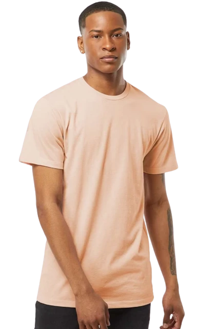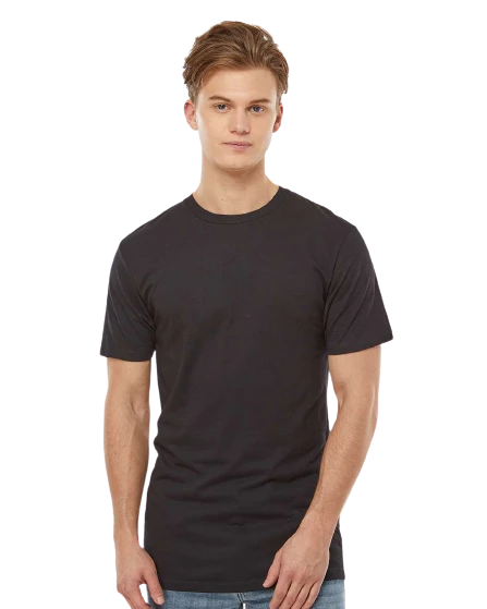 4.3 oz., 50/50 combed ringspun USA premium cotton/polyester fine jersey, 30 singles